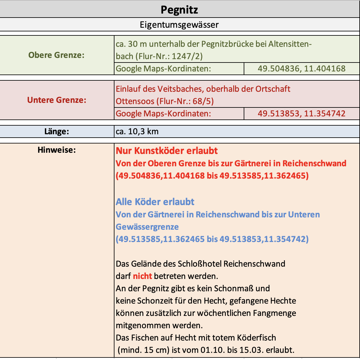Flussaufwärts wurden 1,5 km bis zur Leichendorfer Mühle und flussabwärts ca. 1,0 km bis zum Zaun an der Kläranlage Zirndorf später hinzu gepachtet.